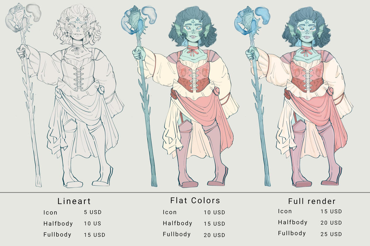 You can place multiple orders in one mail, just include the above info multiple times.Please include reference images of your character(s). If there is anything specific you would like me to get inspired from (e.g. environment for background or stock images for poses) please include them as well.
